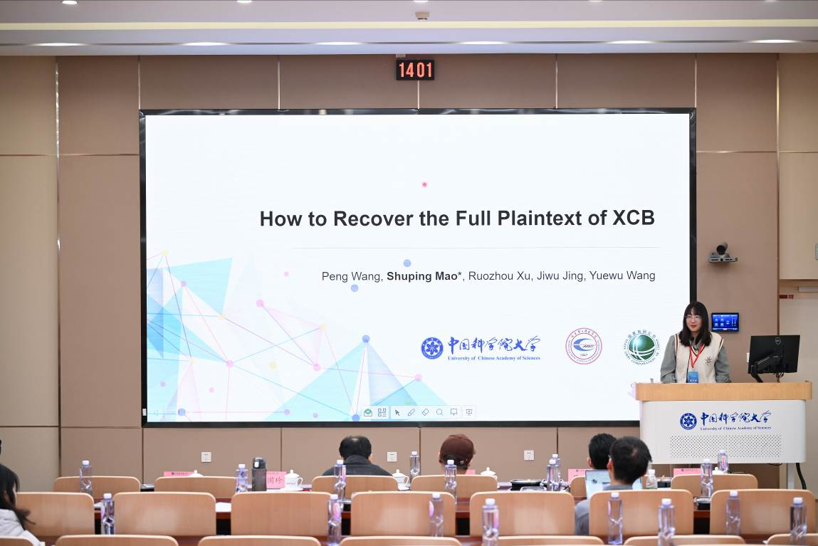 下午的论文环节由国科大密码学院助理研究员边毅主持。北京电子科技学院讲师毛淑平分享了论文“How to Recover the Full Plaintext of XCB”,介绍了针对XCB方案所有版本的3种明文恢复攻击,包括3次、4次查询的部分明文恢复攻击和7次查询的全部明文恢复攻击。