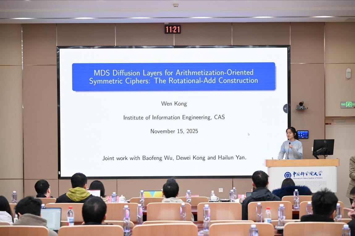 中国科学院信息工程研究所在读硕士生孔雯分享论文“MDS Diffusion Layers for Arithmetization-Oriented Symmetric Ciphers: The Rotational-Add Construction”。该研究介绍了一类基于循环移位与加法/减法操作的扩散层结构(rotational-add 扩散层),首次对rotational-add MDS扩散层进行系统的理论刻画,并给出了其显式构造方法。
