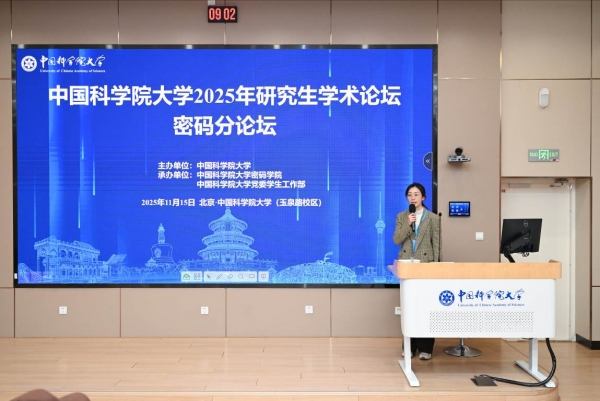 2025年11月15日,中国科学院大学2025年研究生学术论坛密码分论坛在玉泉路校区成功举办。本次论坛由中国科学院大学主办、密码学院承办,论坛主题为“理论融合实践,密码链接未来”。来自中国科学院大学、华东师范大学、南京邮电大学、北京电子科技学院以及蚂蚁技术研究院、中国科学技术大学、中国科学院信息工程研究所等多个科研院所40余位师生参加论坛。密码学院副教授闫海伦主持论坛开幕式。