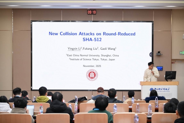 华东师范大学副教授李迎新以“针对减少轮 SHA-512 的新碰撞攻击”作大会报告。李迎新长期从事SHA-2哈希函数进行实际碰撞攻击工作,他和与会师生分享了构建新型局部碰撞路线的相关具体工作进展。