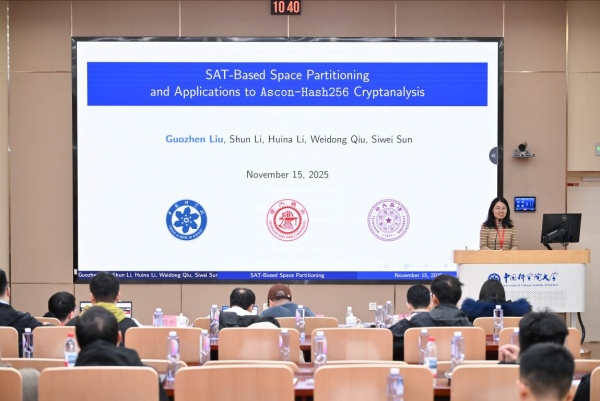 中国科学院大学助理研究员刘国珍以“SAT-Based Space Partitioning and Applications to Ascon-Hash256 Cryptanalysis”为题作分享报告。她介绍了一种基于 SAT 的空间划分分析技术,该技术在应对复杂搜索空间问题方面具有突出优势,为Ascon-Hash256的安全性评估提供了新的视角。