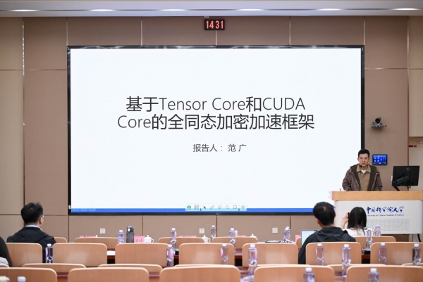 蚂蚁技术研究院助理研究员范广以“基于Tensor Core和CUDA Core的全同态加密加速框架”为题作交流报告。他介绍了针对全同态加密的加速工作,详细讲述了通用和专用计算单元两种技术路径下的设计思路与关键技术,展示如何利用不同类型的硬件单元高效应对FHE加速挑战。
