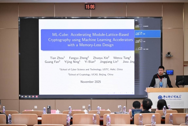 中国科学技术大学在读博士生周天分享了“一种基于AI加速器模格密码的无内存优化实现框架”,介绍了名为 ML-Cube (ML³)的新型无内存框架。该框架通过对机器学习加速器内部机制的深入分析,为模格后量子密码算法加速设计了定制的数学变换,使得(I)NTT和多项式乘法得以在无内存模式下运行,显著减少对外部内存的依赖并降低延迟。