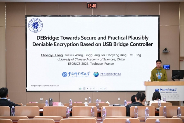中国科学院大学在读博士生龙重余分享论文“DEBridge: Towards Secure and Practical Plausibly Deniable Encryption Based on USB Bridge Controller”,介绍了一种新型可否认加密方案,该方案无需依赖配套软件、特定操作系统以及文件系统/存储介质,克服了现有方案在部署上的局限性,能够让用户即使在受到威胁、被迫泄露密钥的情况下,仍然可以保护敏感数据的安全。